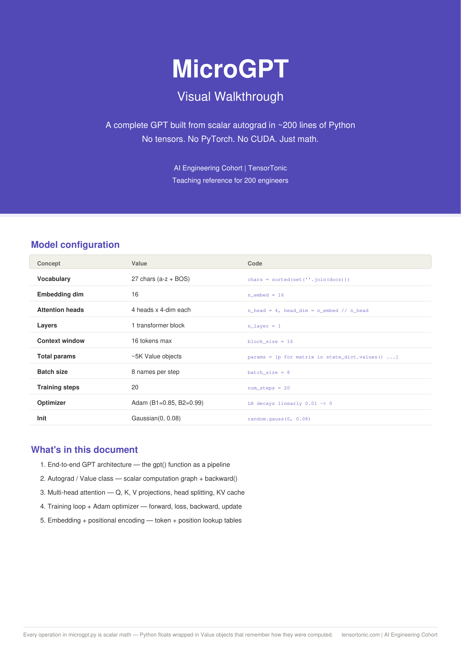 The complete MicroGPT architecture on one page. Every concept maps 1:1 to a line in the code above.